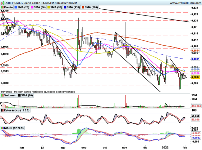 Por debajo es muy importante que se mantenga por encima de 0,0875€, su perforación aplazaría la posible ruptura alcista.