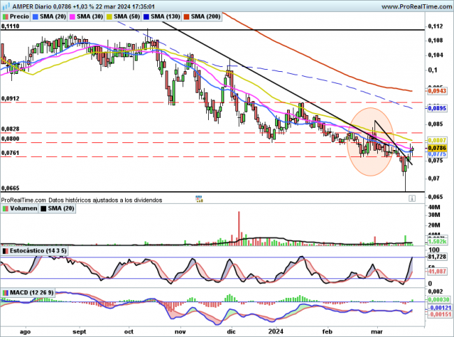 Por debajo es fundamental no perforar el nivel de 0,076€, si ocurriese podría tener de nuevo una caída hacia los mínimos marcados en 0,067€