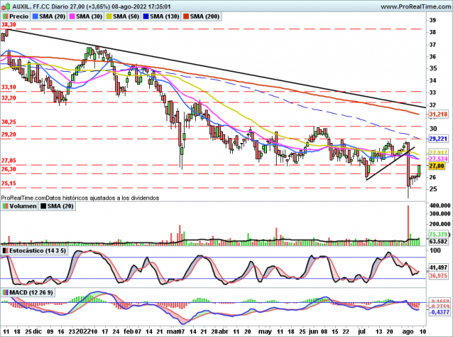 Para corto plazo si es capaz de recuperar al cierre 27,05€ el siguiente objetivo lo tendría nuevamente en 29€ que fue una resistencia anterior y a su vez el origen del movimiento bajista.