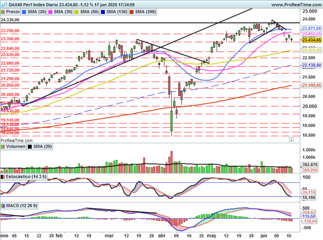 Desde el mes de mayo el índice se encuentra formando soporte en el nivel de 23350, que se puede hablar ya de 23300 por ser la cifra redonda inmediata y desde entonces han sido ya 5 las ocasiones en las que el índice ha rebotado desde esos niveles.