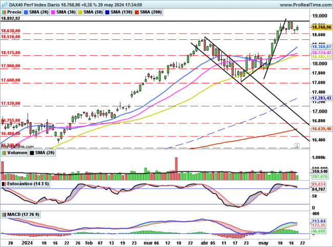 Para corto está claro que 18630 es el primer soporte, por debajo 18500 son los máximos de marzo y ya a partir de ahí tendría soporte en 18175 puntos que fueron los máximos marcados durante el mes de abril.