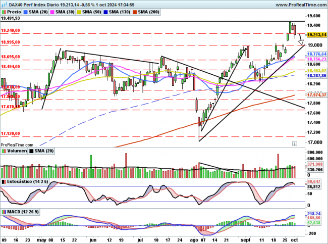 De momento ha perdido el GAP alcista del viernes en 19240, este GAP alcista ha funcionado durante la sesión como soporte hasta que fue perforado y ahora deja el siguiente GAP a cerrar en 18995 que fue la zona de máximos anteriores.