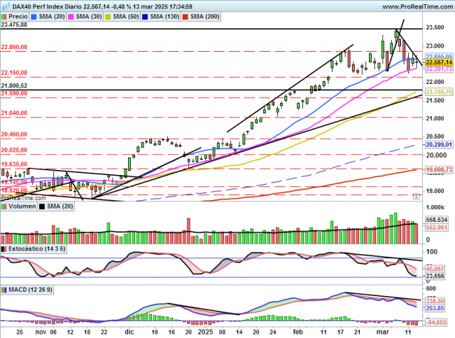 Por debajo en caso de perforar la zona de 22390 (media de 30 sesiones) podría cerrar el GAP alcista de 22150 puntos y posteriormente buscar los 21800721590 puntos.