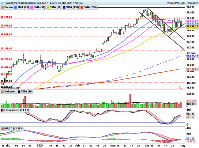 Salvo sorpresa mayúscula en la sesión de este jueves el DAX debe recoger la caída de wall street de la jornada del martes y del miércoles, por tanto es de esperar un GAP bajista en 17932 puntos que perfore el soporte clave de 17900.