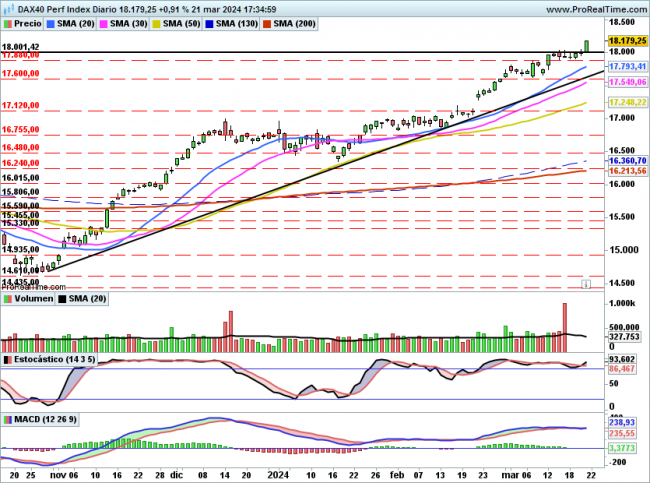 Ahora mismo como ya indicamos días atrás el objetivo si superaba los 18020 se encuentra en 18300/18400 puntos.