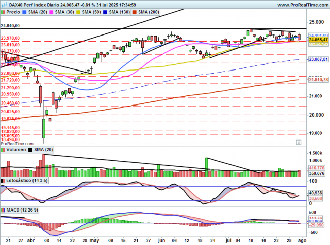 El índice conseguía mantenerse en todo momento por encima de 23970 puntos desde el 7 de julio, dicho soporte parece que peligra este viernes.