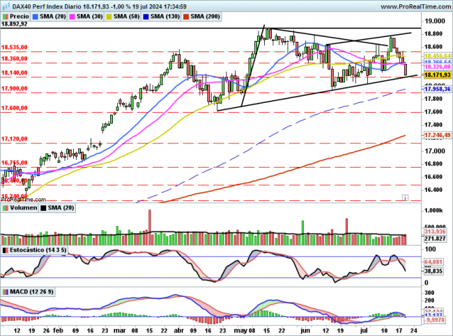 Si el mercado el lunes abre con un GAP a la baja y este GAP es cerrado podría ser señal de rebote cuyos objetivos se situarían en 18360 puntos y por encima 18535 y 18800 puntos.