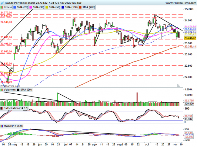 Para corto plazo la primera resistencia que tendría el índice se situaría en 24100 y posteriormente 24350 puntos, si se mantiene por debajo de estos niveles es muy probable que termine cediendo la zona de 23685 en cuyo caso no tendría soporte hasta 23400/23060 puntos.