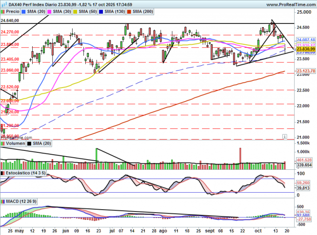 A corto plazo el rebote podría tener continuidad hacia 24270 puntos, zona esta ultima que se corresponde a un soporte anteriormente perforado y que fue causante de la ultima caída hasta 23680 puntos.