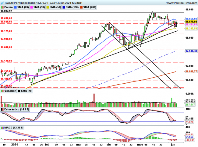 Al cierre vuelve a recuperar el nivel de 18510 aunque mantiene máximos decrecientes.