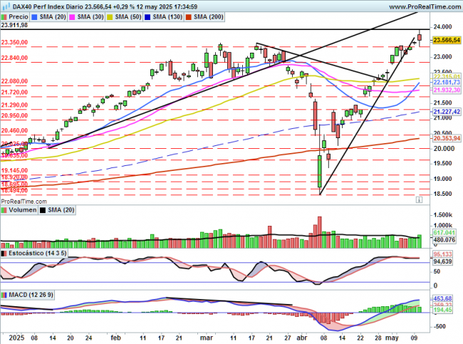 A diferencia de EEUU que superaba máximos con holgura (+3,25%) el DAX apenas subía 0,29%, incluso a 1 hora del cierre el índice se situaba en negativo llegando a perder toda la subida del viernes, punto clave donde el mercado consiguió rebotar, no obstante la venla es de “indefinición·
