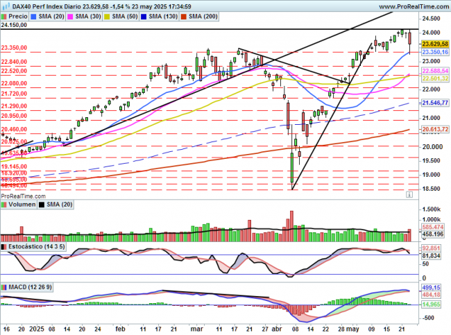 La “amenaza” de imponer aranceles del 50% el 1 de junio llevaba al DAX al soporte clave de 23350 puntos, un soporte correspondiente a la zona de máximos y mínimos relativos anteriores que por el momento ha vuelto a funcionar.