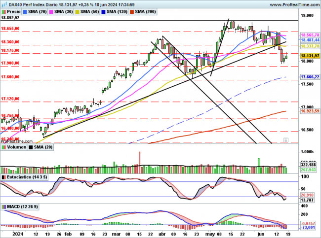 Para corto plazo como ya indicamos días atrás la resistencia es clara en 18360 puntos, este nivel coincide con el suelo formado durante el mes de mayo/junio y no debería ser fácil recuperarlo, si lo hiciera tendría recorrido hasta 18655. Por debajo sigue teniendo el objetivo bajista en la zona de 17800 puntos