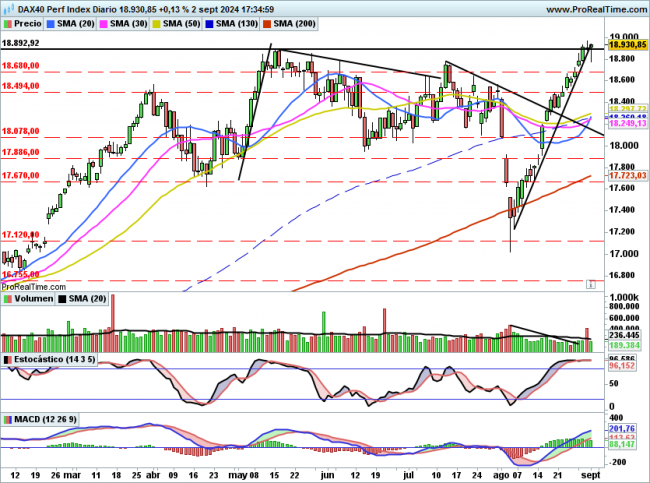 La resistencia clave eran los 18900 puntos y esta resistencia fue superada hace 2 sesiones, sin embargo no termina de arrancar y hoy aunque ha cerrado en máximos diarios ha marcado un mínimo en 18778 puntos.