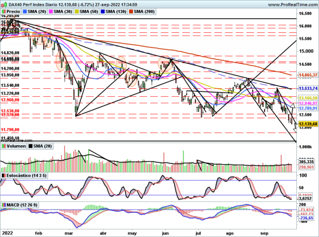 Dicho esto, la directriz bajista desde máximos en 13550 sigue vigente y la clave para ver un rebote es la misma que todos los días , superar al cierre el máximo de la sesión anterior, en el momento que lo consiga habrá rebote casi con total seguridad, cuyos objetivos se situarían en 12530 y posteriormente 12960 como mínimo
