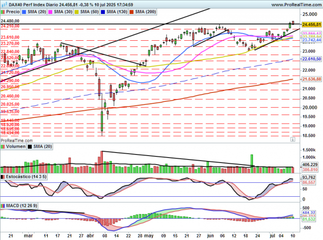 El estocástico se mantiene en sobrecompra, el MACD sigue en positivo y el volumen se encuentra por debajo de la media diaria del último mes.
