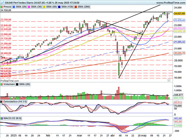 A corto todo sigue igual , la resistencia clave sigue estando en 24150, quizás se mantenga vigente el soporte intermedio de 23830 puntos, no obstante el más importante son los 23350 que fueron los máximos anteriores.