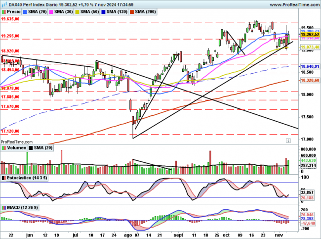 Viendo el grafico se aprecia un rebote desde la apertura hasta incluso superar la directriz alcista precisamente perforada y la media de 30 sesiones en 19318 puntos.