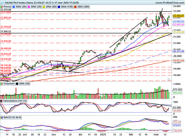 En la jornada del viernes el acuerdo de Merz con los verdes impulsaba al índice por encima de la resistencia de 22860 puntos, esta ruptura de momento está teniendo continuidad y el índice se aproxima ahora a la gran resistencia situada entre los 23310 puntos y los 23475 puntos.