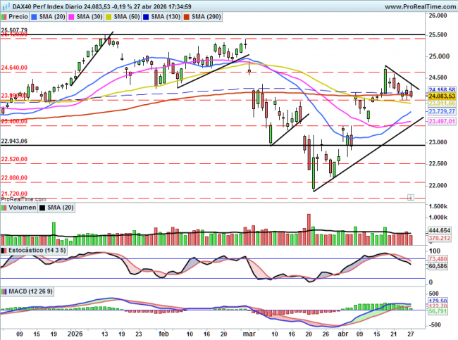 Por arriba como primera resistencia tendría el nivel de 24400 puntos, si es capaz de superar la directriz bajista actual podría iniciar un nuevo tramo alcista con objetivos 24800 y 25500 puntos.