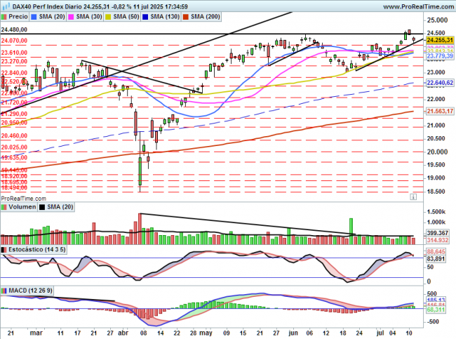 De momento tiene soporte en 24070, este nivel se corresponde con el máximo anterior y un GAP alcista del 8 de julio además de la directriz alcista desde mínimos.