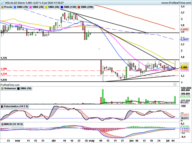 Como indicamos anteriormente en caso de cierre por debajo de 1,38€ si que podría ir a 1,20€, aunque esto ultimo parece descartado.