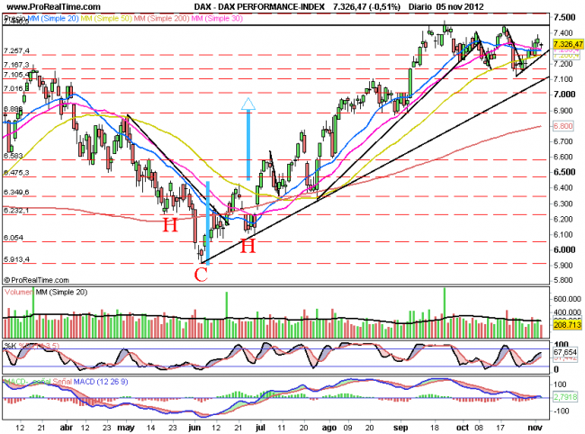 DAX: En la sesión de hoy cumplió el guion previsto, a diferencia del IBEX35 el DAX puso freno a las caídas mucho antes de lo esperado que era el 7257.
