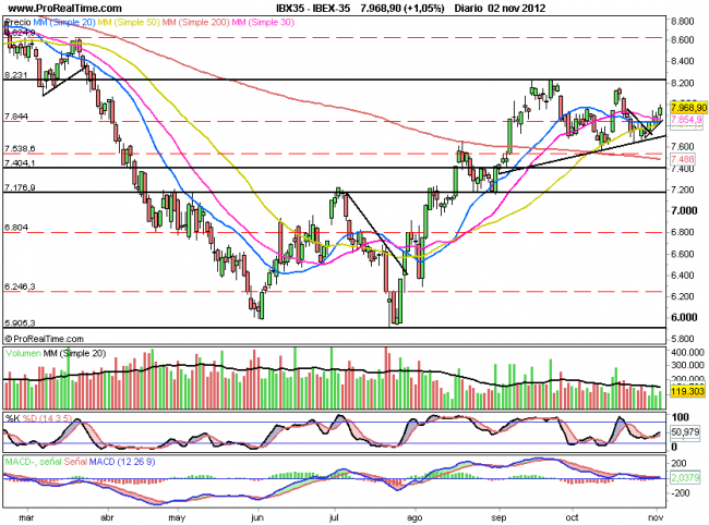 Por arriba si mañana recupera 7850 que es muy probable podría volver a intentar alcanzar los 8200, de lo contrario se podrían ver los 7730 ,aun así no es mucho mas caída pero si que esta tocado el índice en comparación con el DAX.