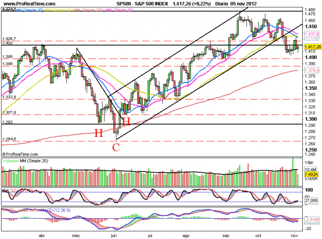 SP500: Rebota muy tímidamente tras apoyar cerca de 1400, para corto la situación sigue siendo de indefinición, si por abajo conserva los 1400 es probable que al menos la corrección haya terminado, en cambio por arriba debería superar 1434 máximos del viernes para confirmar una vuelta a máximos en 1470.
