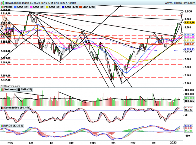 De momento el índice aguanta, en las ultimas 4 sesiones se ha movido entorno a los 8700 puntos, en el día de hoy consiguió superar 8710 puntos, si bien la subida no es excesiva.