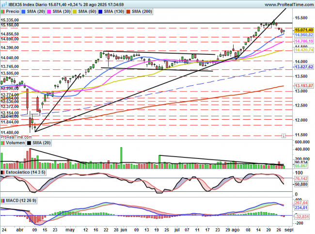 Por arriba si supera 15100 se podría dar por finalizada la corrección siendo probable un vuelta hacia máximos en 15300/15400 puntos.