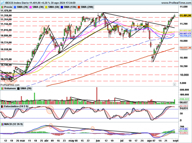 Por encima superando 11470 quedaría prácticamente en subida libre, máximos de muchos años y sin resistencia quizás hasta la zona de 12000.