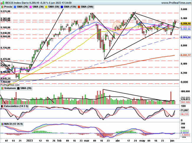 Perforar en cambio el nivel de 9276 al cierre implicaría iniciar una corrección cuyo primer objetivo se situaría en el GAP alcista del viernes de 9168 puntos y posteriormente el mínimo anterior en los 9050.