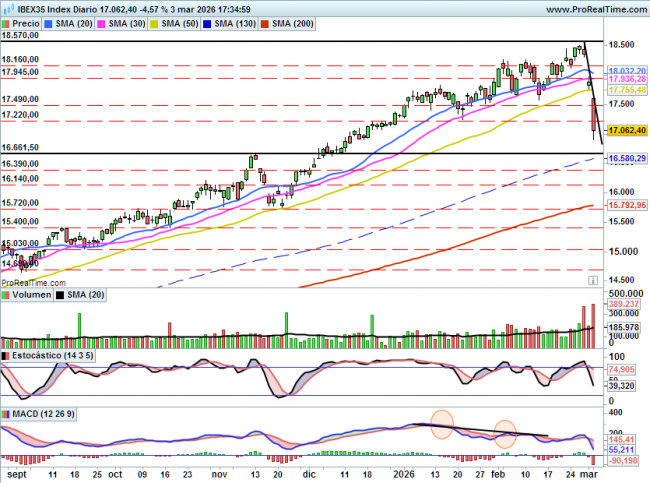 Por arriba quedaría esperar que dibuje algún mínimo creciente y supere el máximo de la sesión precedente para pensar en un rebote, en cuyo caso dicho rebote podría servir para buscar los 17500 puntos.