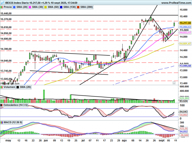 La media de 30 sesiones cuya pérdida comentamos como clave en el pasado y que una vez recuperada al superar los 14800 puntos ha disparado al precio, se encontrará también dentro de poco en esos 15000 puntos, si fuese perforado el nivel de 15000 si que podríamos entrar en un nuevo escenario de corrección.