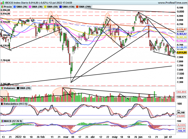 Para confirmar rebote tiene que superar 8140 , de lo contrario el escenario bajista con objetivo 7784 se mantiene y hoy se ha quedado cerca.