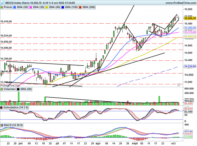 De momento el índice frenaba su caída en el mínimo de las 2 últimas sesiones, si bien el soporte clave sigue siendo 15416 que son los máximos anteriores, si se mantiene por encima sigue prácticamente en subida libre, pero en caso de perder 15400 si que podría hacer el camino de vuelta hacia los 15080/15024 puntos