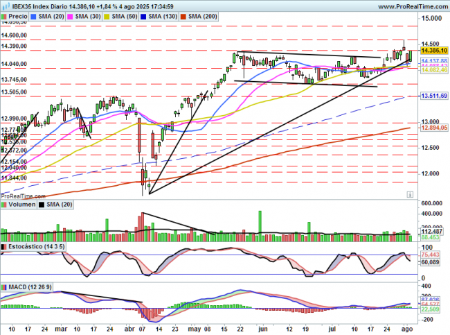 Para corto plazo si consigue cerrar por encima de 14400 es muy probable que podamos tener un movimiento alcista hasta máximos del jueves en 14600 puntos.