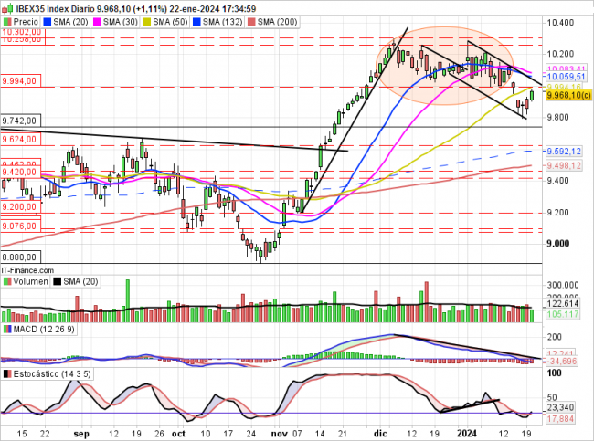 Por encima de 10.030 puntos al cierre el escenario probable pasaría por una vuelta hacia los 10260/10300 puntos.