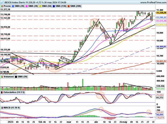 La jornada comenzaba con la pérdida de 11152 dejando un pequeño GAP bajista y desde ahí ha rebotado, cerrando primero el GAP bajista de apertura y a continuación el GAP bajista del día de ayer, todo ello para cerrar cerca de máximos en 11377 puntos.