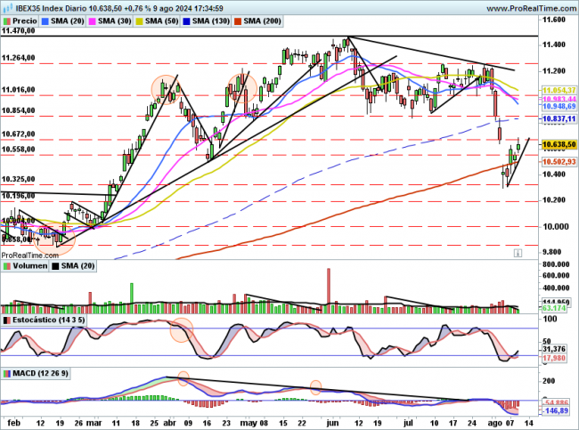 Técnicamente como ocurre en el SP500 tenemos un GAP bajista que superar en 10672 y un soporte clave en otro GAP alcista en 10325.