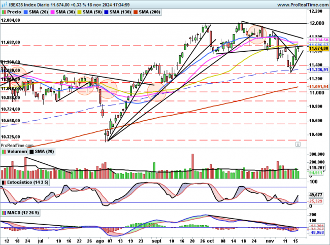 El volumen en el rebote es inferior a la media diaria del ultimo mes, el estocástico ha marcado compra, el MACD sigue bajista.