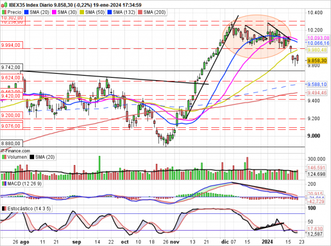 Por debajo el único soporte real ahora mismo lo tiene en 9742 puntos, zona que se corresponde a los máximos de julio de 2023