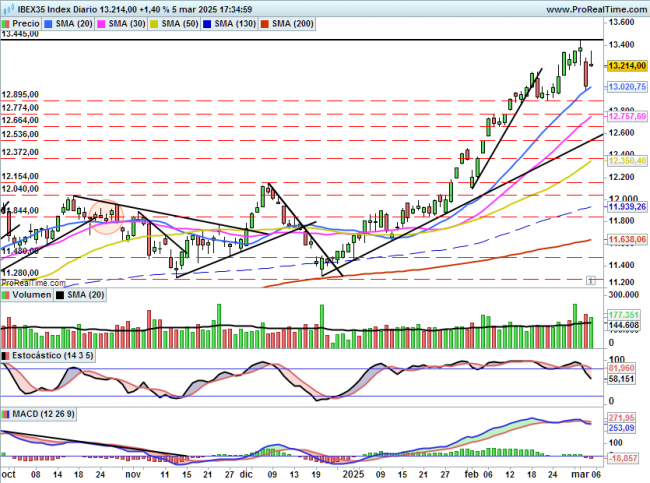 Perforar el nivel de 12900 implicaría aumentar la corrección, quizás con objetivo en la directriz de 12600 puntos.