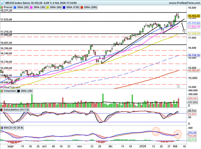 En caso de pérdida de 17835 al cierre sí que complicaría el aspecto técnico, si llega a ocurrir podríamos tener una corrección hacia la zona de 17065/17200 puntos.