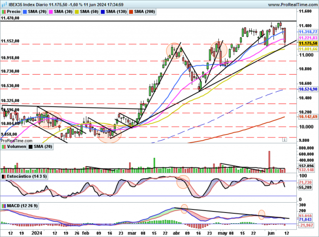 Técnicamente mientras se mantenga por encima de los mínimos de hoy el fondo seguirá siendo alcista, para confirmar un rebote debería situarse por encima de 11220, en ese caso podría recuperar nuevamente hacia 11470 puntos.
