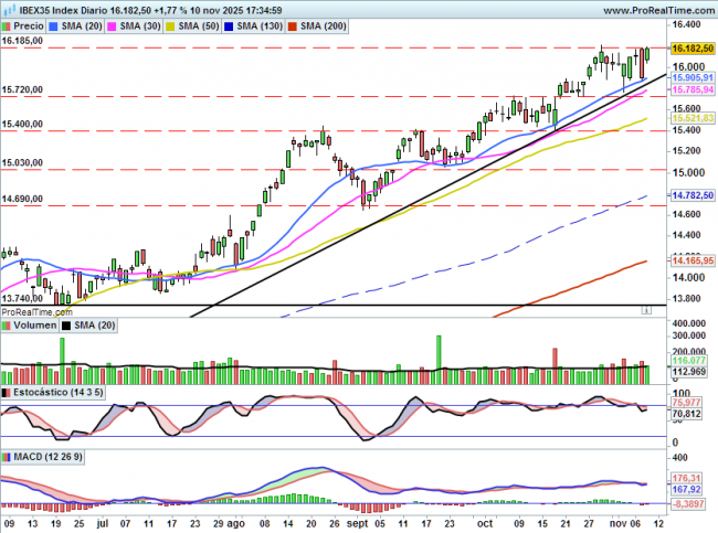 En la actualidad superando 16200 entraría en subida libre y el nuevo soporte se situaría en los 16180 puntos.