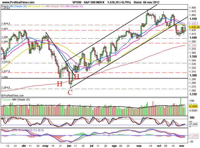 SP500: En la sesión de hoy se ha girado el mercado justo en los máximos del pasado viernes en 1434.