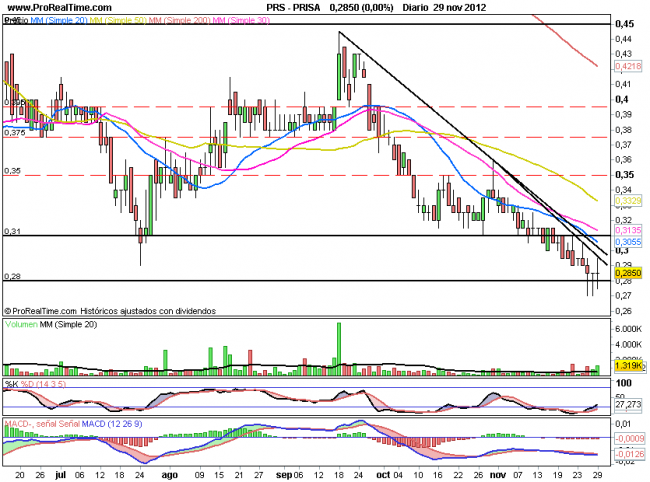 En la sesión de hoy PRISA ha logrado nuevamente cerrar por encima de 0,28€ tras perforarlos durante la sesión.