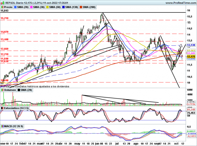 Por técnico al cierre ha perforado ligeramente el nivel de 12,20€ y la directriz alcista de corto plazo, deteriorando así el aspecto.